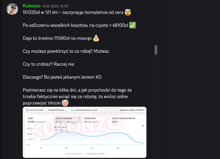 Bez zbędnego teoretycznego pierdolenia pokazuję Ci krok po kroku, jak wygląda droga do takich wyników: od wyboru produktu, przez filmy, które sprzedają, aż po moment, w którym kasa realnie wpada na konto.